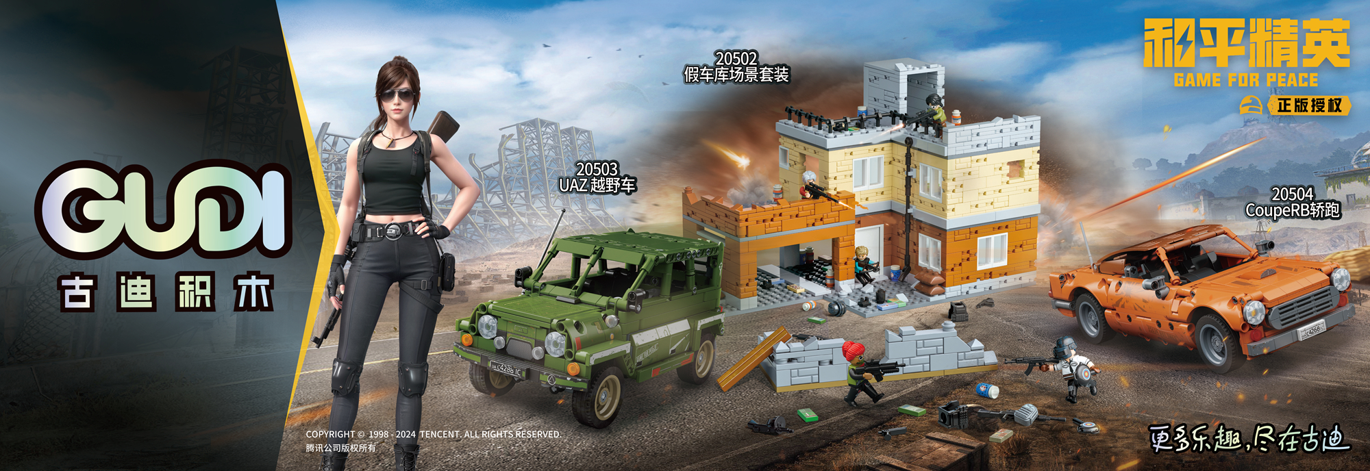 這次積木行業(yè)領(lǐng)軍品牌古迪積木與國民級手游《和平精英》強(qiáng)強(qiáng)聯(lián)合, 瞄準(zhǔn)年輕開放的Z時代,以《和平精英》游戲中的各種元素為設(shè)計靈感,結(jié)合古迪豐富聯(lián)名經(jīng)驗(yàn)和優(yōu)質(zhì)的產(chǎn)品設(shè)計和品質(zhì),共同推出一系列聯(lián)名周邊產(chǎn)品:包括游戲中最具代表性的地圖場景——海島建筑、假車庫2款場景積木。其中假車庫場景套裝積木搭配了13款《和平精英》高精度積木人仔,包括游戲中經(jīng)典4人小組角色,逼真的表情和特色設(shè)計展現(xiàn)出不同角色的個性和特點(diǎn);還配備降落傘、空投箱、若干武器細(xì)節(jié)配件;多處可動玩法的小設(shè)計,用積木還原《和平精英》中充滿戰(zhàn)斗激情的戰(zhàn)場,可與家人、小伙伴們一起進(jìn)行互動模擬作戰(zhàn)。
